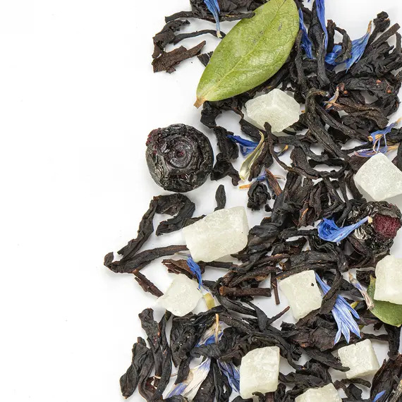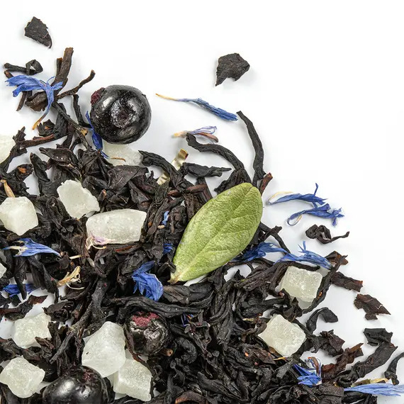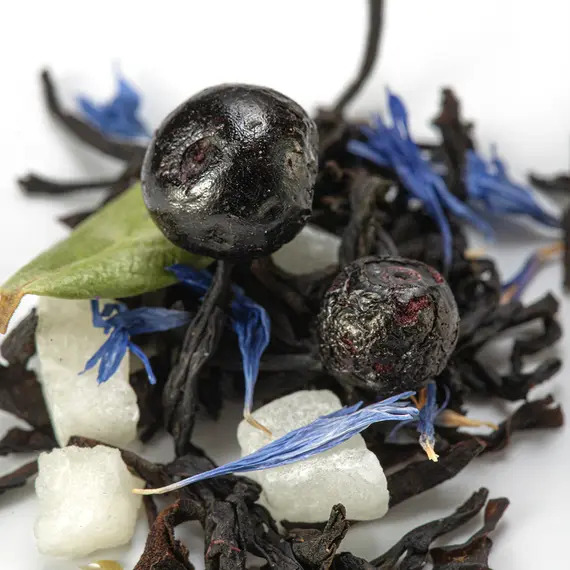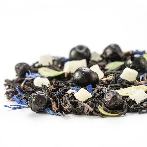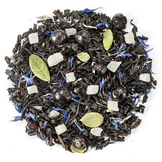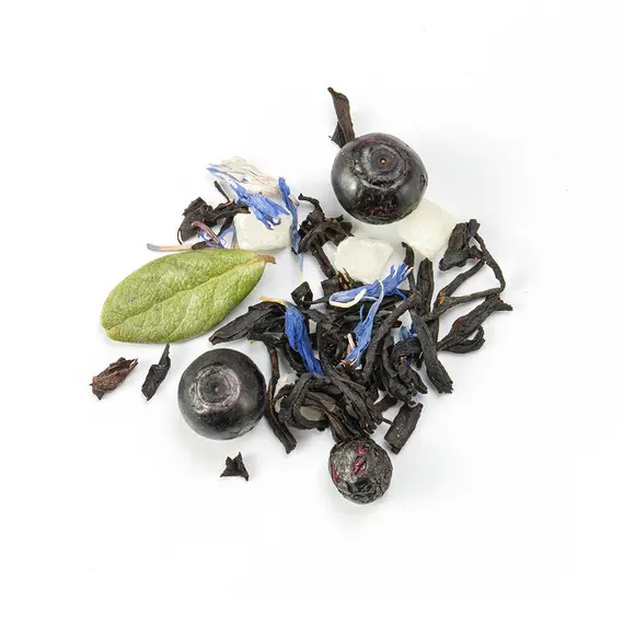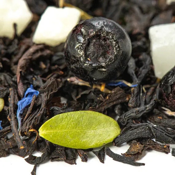 Состав: чай чёрный индийский, кусочки ананаса, ягоды черники, лепестки василька, листья брусники, аромат черники и сливок.