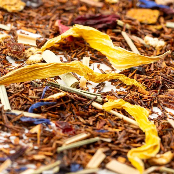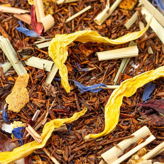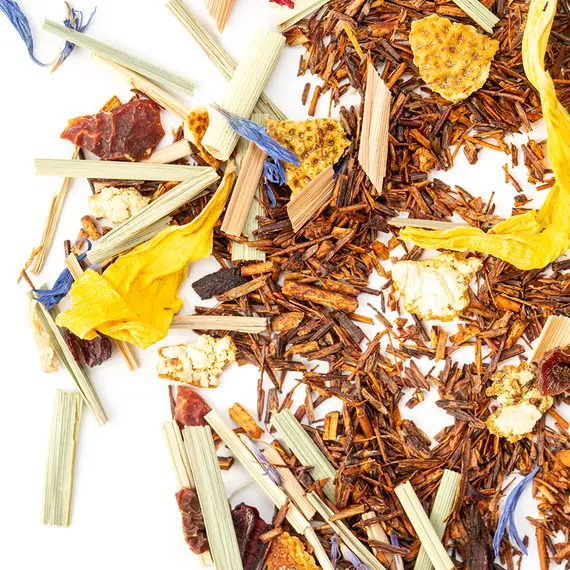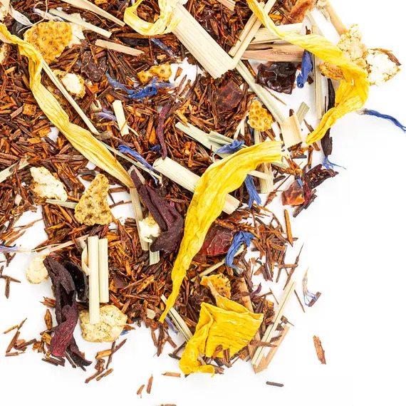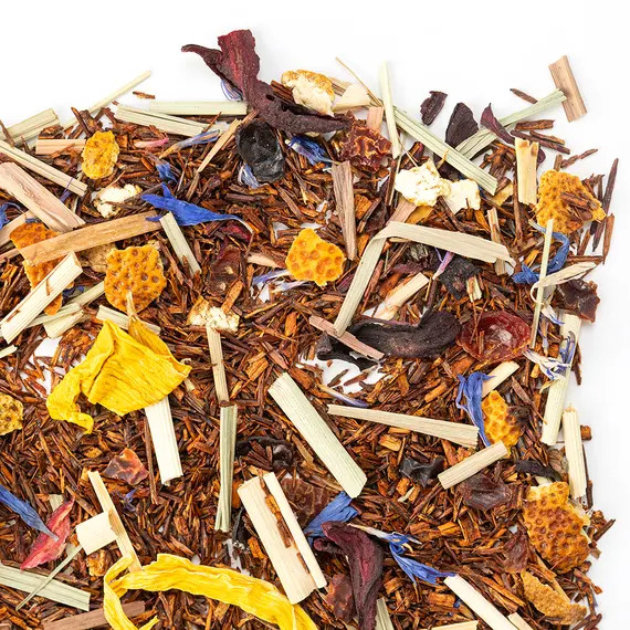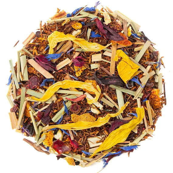 Яркий и стильный купаж для тех, кто ценит насыщенные цитрусовые ароматы и экзотическое настроение. В его основе — отборный ройбуш с мягким, глубоким вкусом, дополненный нотами лимона, грейпфрута и лайма, создающими свежий и бодрящий букет. Апельсиновая цедра и лимонная трава придают чаю выразительную кислинку и искристый аромат. Плоды шиповника и каркаде добавляют лёгкую фруктовую терпкость и красивый рубиновый оттенок напитка, а лепестки василька и подсолнечника — изысканную цветочную ноту и эстетичную подачу.